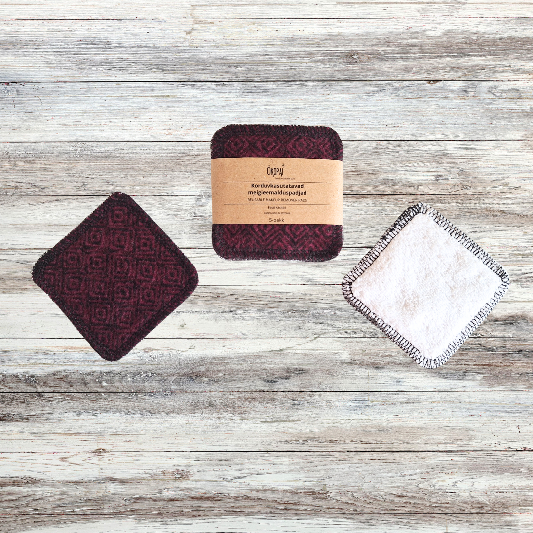 Korduvkasutatavad meigieemalduspadjad, säästad nii  raha kui ka loodust, jättes prügikasti viskamata tuhandeid ühekordseid meigieemalduspadjakesi. Padjakese üks külg on hellitavalt pehmest 100% puuvillasest flanellist ja teine külg kergelt kooriva efektiga 100% puuvillasest froteest.